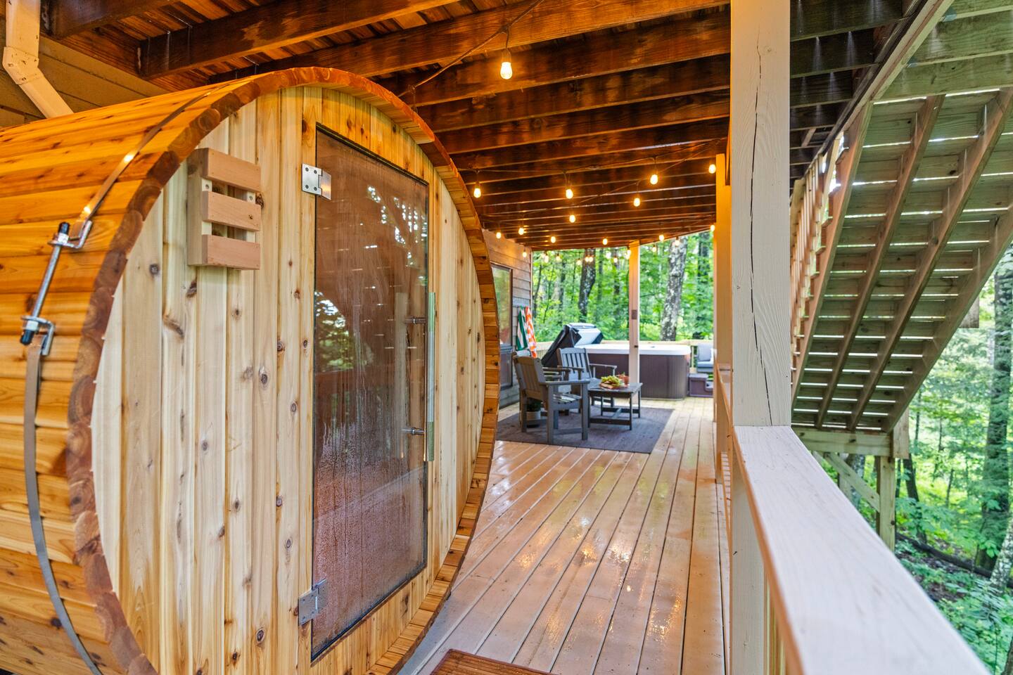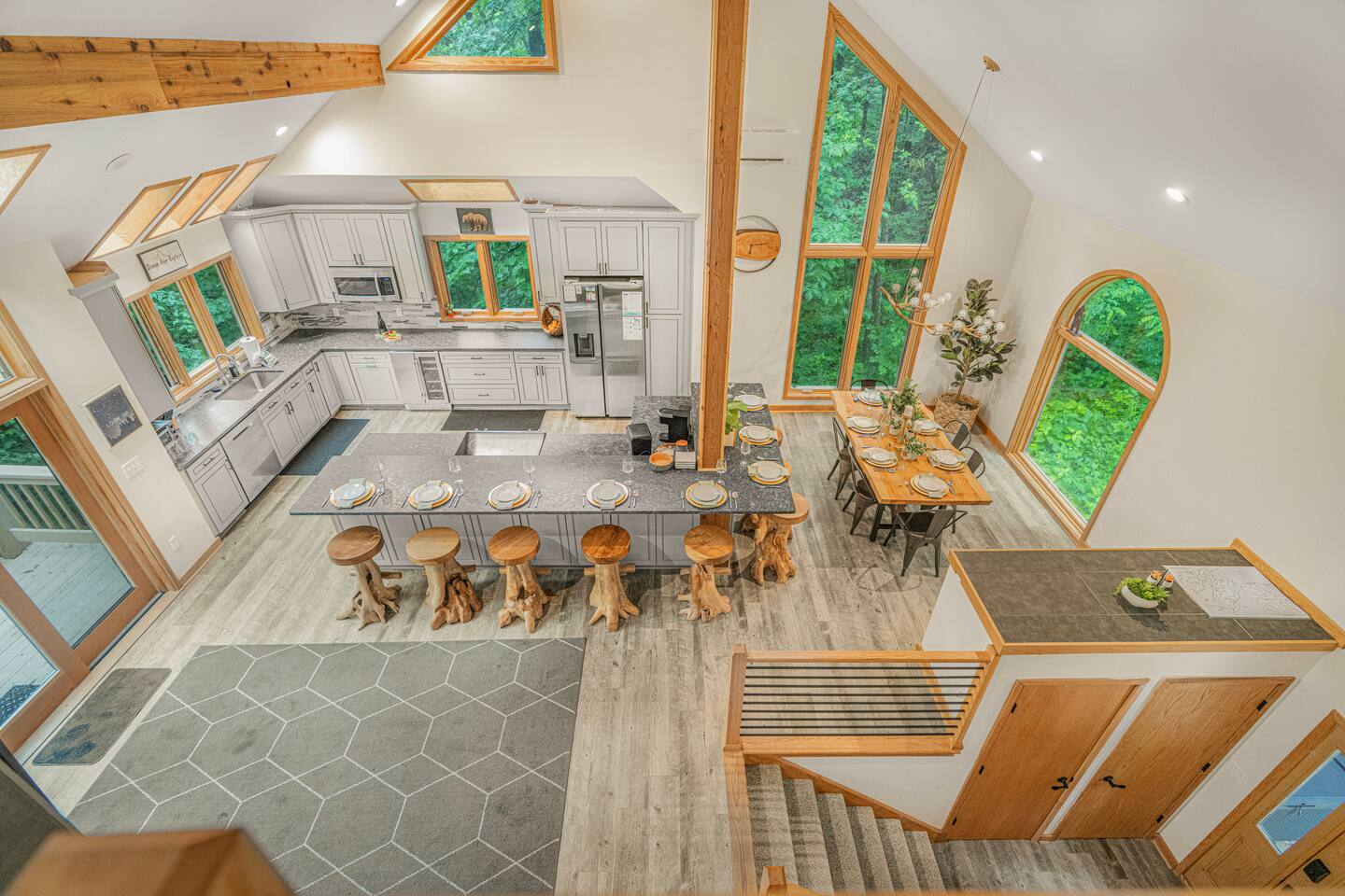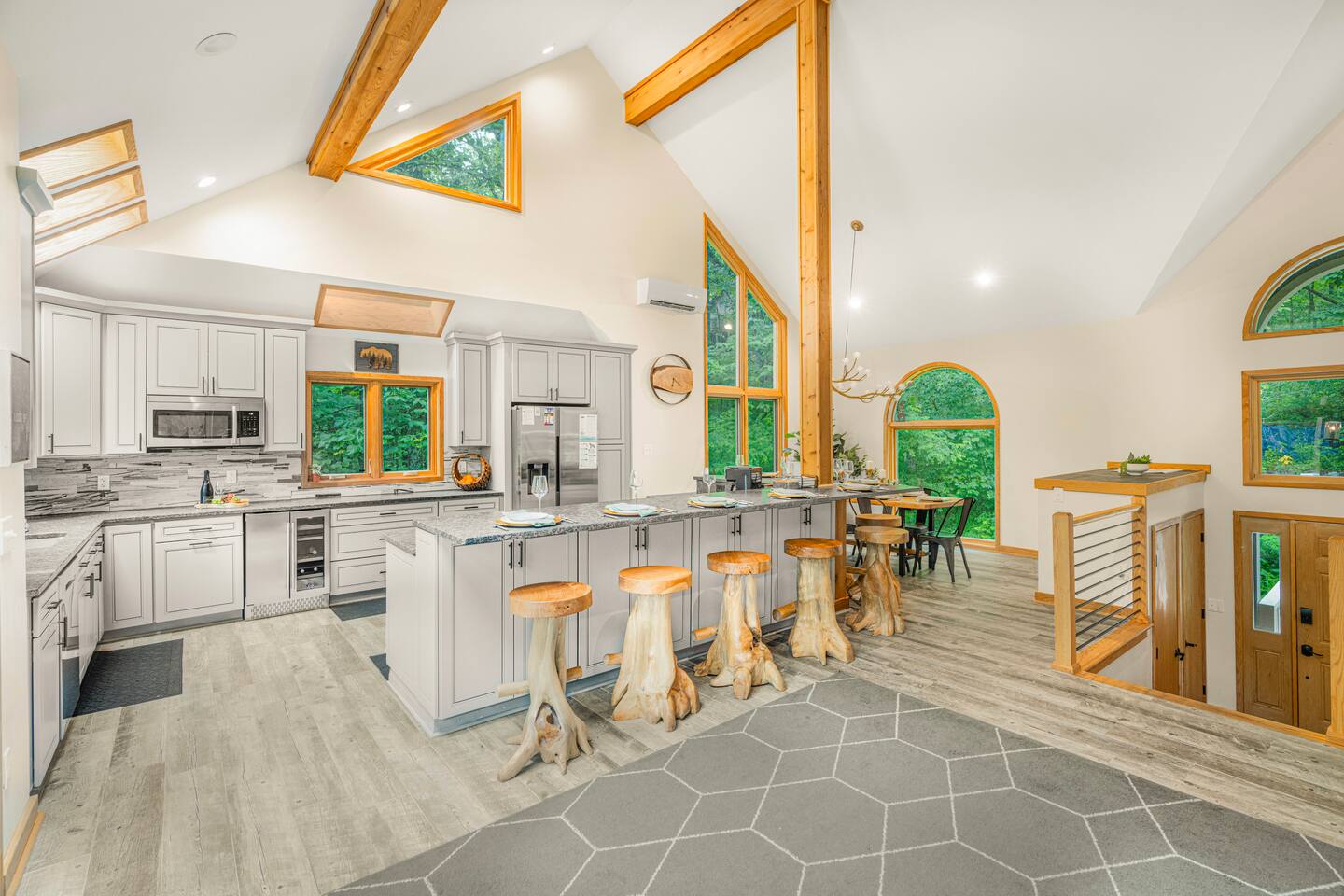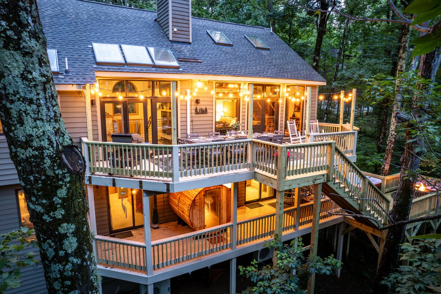 We are located in the heart of beautiful Wintergreen Virginia, which has tons to do for all ages, year-round. Mountain Treehouse is just a few minutes’ drive to the slopes and all the dining and entertainment at Wintergreen. Some of the best hiking trails in the state are off the Blue Ridge Parkway (15 minutes from the home), plus there are other great trails just down the street. Also nearby are two sandy-beach-entrance lakes plus a community pool for swimming, and over dozen wineries, breweries, and distilleries- all within a 30 minute drive. Additionally, after a 5 min hike to the base of our property, there is a hiking trail along a creek. In the summer time, supervised kids can play in the creek while adults breathe in the peaceful nature. After heavy rains, you can even hear the rushing waters from the mountain stream at the base of the property. Along that trail is a moderate hike out to Shamokin Falls, Wintergreen's own waterfall! The house has 4 bedrooms plus loft bedroom, and 3 bathrooms, with the layout as follows: Main level: - Main level deck features outdoor dining for 10, gas grill, rocking chairs, and bar seating - Living room with wood burning fireplace (firewood provided), 65" smart TV, and arcade machine - Newly renovated, oversized, and fully stocked kitchen with custom teak root stools surrounding island - Dining area features custom live edge table with seating for 6, plus room for 8 more at the kitchen island (14 seats total) - BR1: King bedroom with dedicated workspace - Full bath with tile shower Lower level: - Lower deck features new hot tub, barrel sauna, fire table (propane provided), and additional outdoor seating - BR2: Master bedroom with king bed and deck access. - Ensuite bathroom of BR2, fully renovated with double vanity, tiled shower, and soaker tub - BR3: King bedroom - BR4: Bunk room with 3 sets of twin-over-twin beds and built-in reading lights - "Jack and Jill" full bath: Shared bathroom between BR3 and BR4 with tile shower - Laundry room with full size washer and dryer Loft: - The Loft area is set up as Bedroom 5, but note that it is open to the living room area so not completely private. This room features a queen bed, smart TV, foosball table, and various games