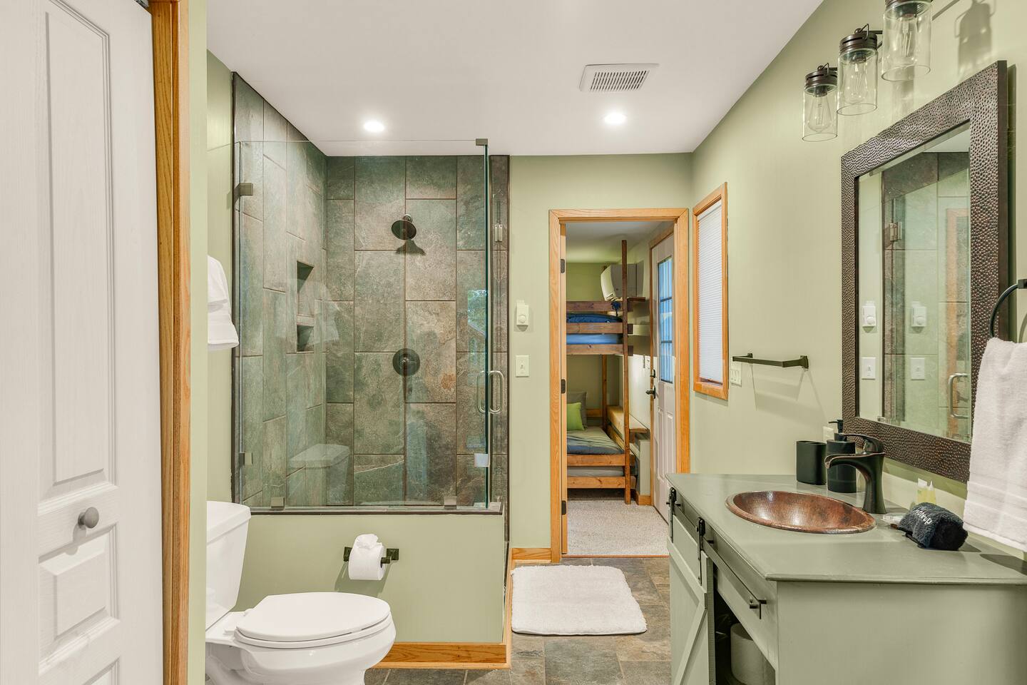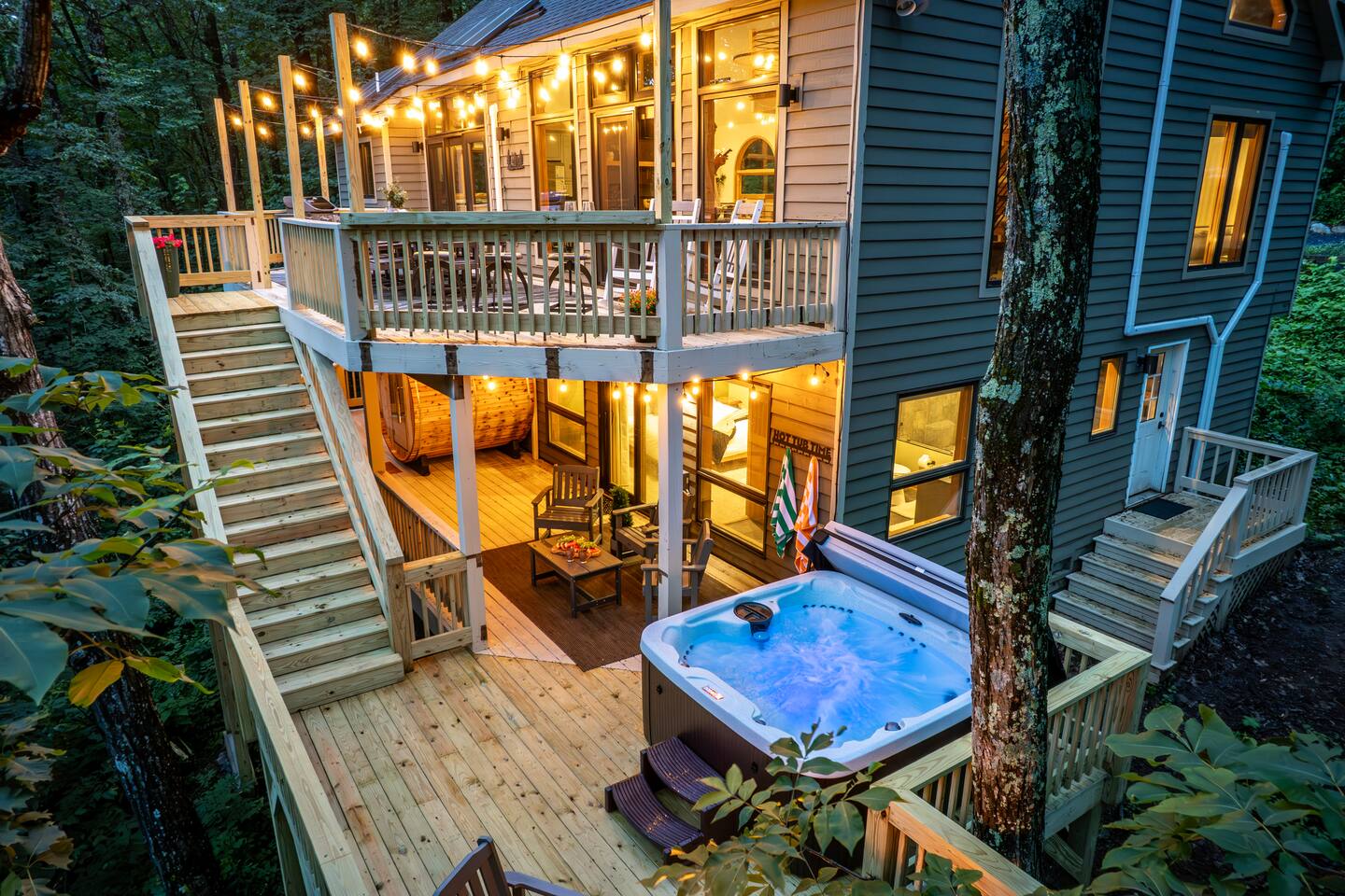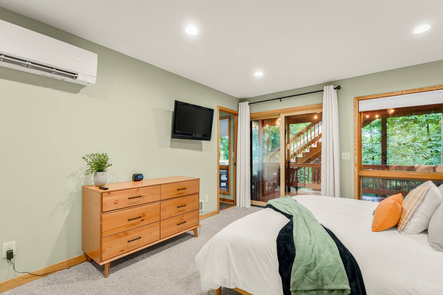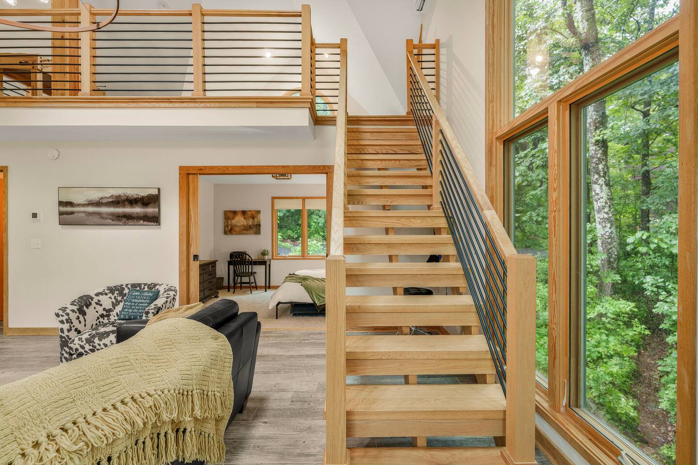 We are located in the heart of beautiful Wintergreen Virginia, which has tons to do for all ages, year-round. Mountain Treehouse is just a few minutes’ drive to the slopes and all the dining and entertainment at Wintergreen. Some of the best hiking trails in the state are off the Blue Ridge Parkway (15 minutes from the home), plus there are other great trails just down the street. Also nearby are two sandy-beach-entrance lakes plus a community pool for swimming, and over dozen wineries, breweries, and distilleries- all within a 30 minute drive. Additionally, after a 5 min hike to the base of our property, there is a hiking trail along a creek. In the summer time, supervised kids can play in the creek while adults breathe in the peaceful nature. After heavy rains, you can even hear the rushing waters from the mountain stream at the base of the property. Along that trail is a moderate hike out to Shamokin Falls, Wintergreen's own waterfall! The house has 4 bedrooms plus loft bedroom, and 3 bathrooms, with the layout as follows: Main level: - Main level deck features outdoor dining for 10, gas grill, rocking chairs, and bar seating - Living room with wood burning fireplace (firewood provided), 65" smart TV, and arcade machine - Newly renovated, oversized, and fully stocked kitchen with custom teak root stools surrounding island - Dining area features custom live edge table with seating for 6, plus room for 8 more at the kitchen island (14 seats total) - BR1: King bedroom with dedicated workspace - Full bath with tile shower Lower level: - Lower deck features new hot tub, barrel sauna, fire table (propane provided), and additional outdoor seating - BR2: Master bedroom with king bed and deck access. - Ensuite bathroom of BR2, fully renovated with double vanity, tiled shower, and soaker tub - BR3: King bedroom - BR4: Bunk room with 3 sets of twin-over-twin beds and built-in reading lights - "Jack and Jill" full bath: Shared bathroom between BR3 and BR4 with tile shower - Laundry room with full size washer and dryer Loft: - The Loft area is set up as Bedroom 5, but note that it is open to the living room area so not completely private. This room features a queen bed, smart TV, foosball table, and various games
