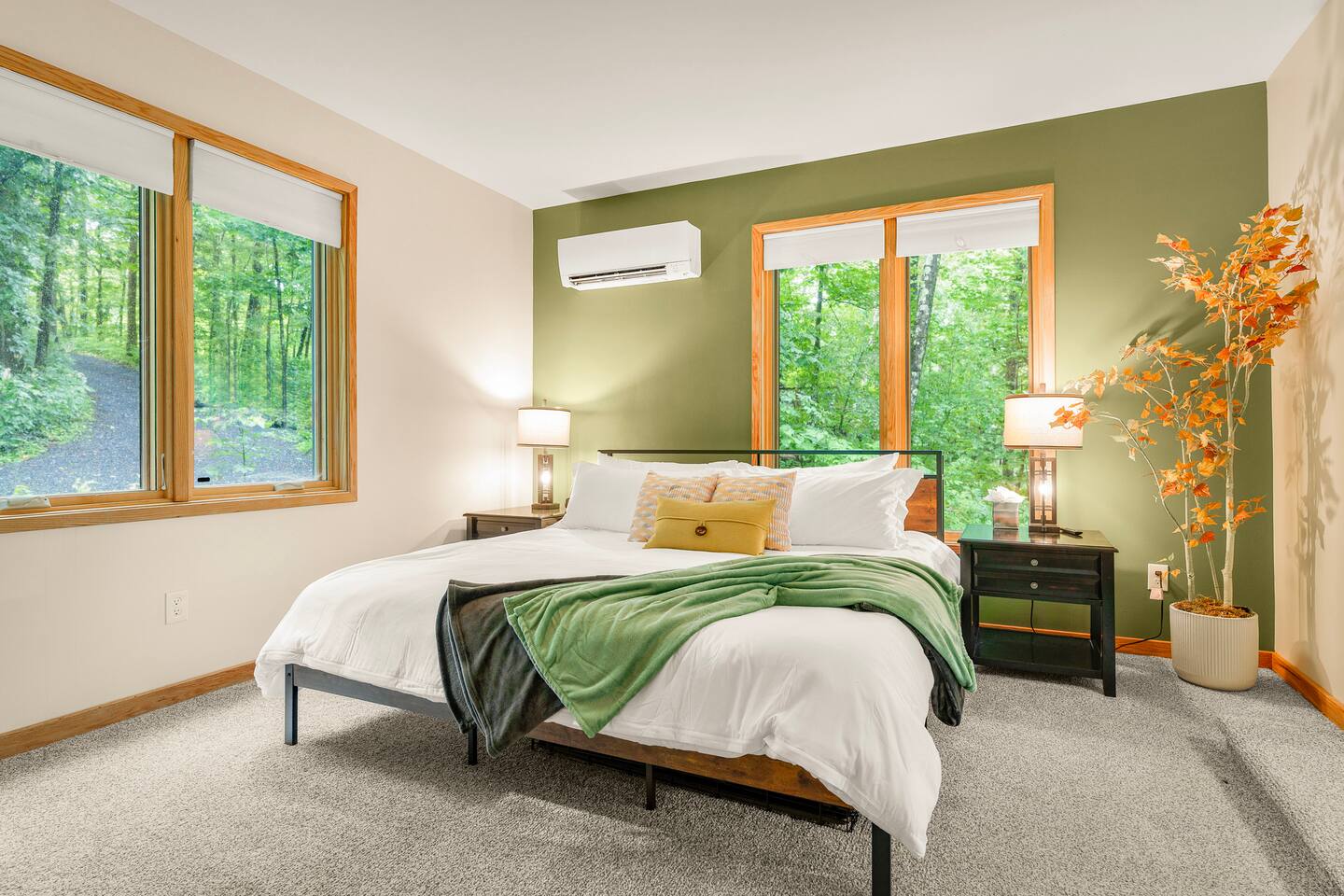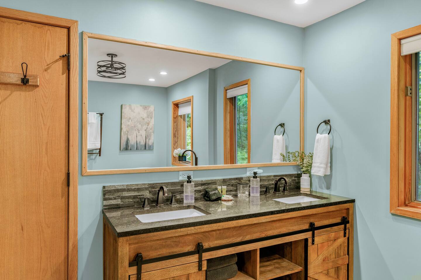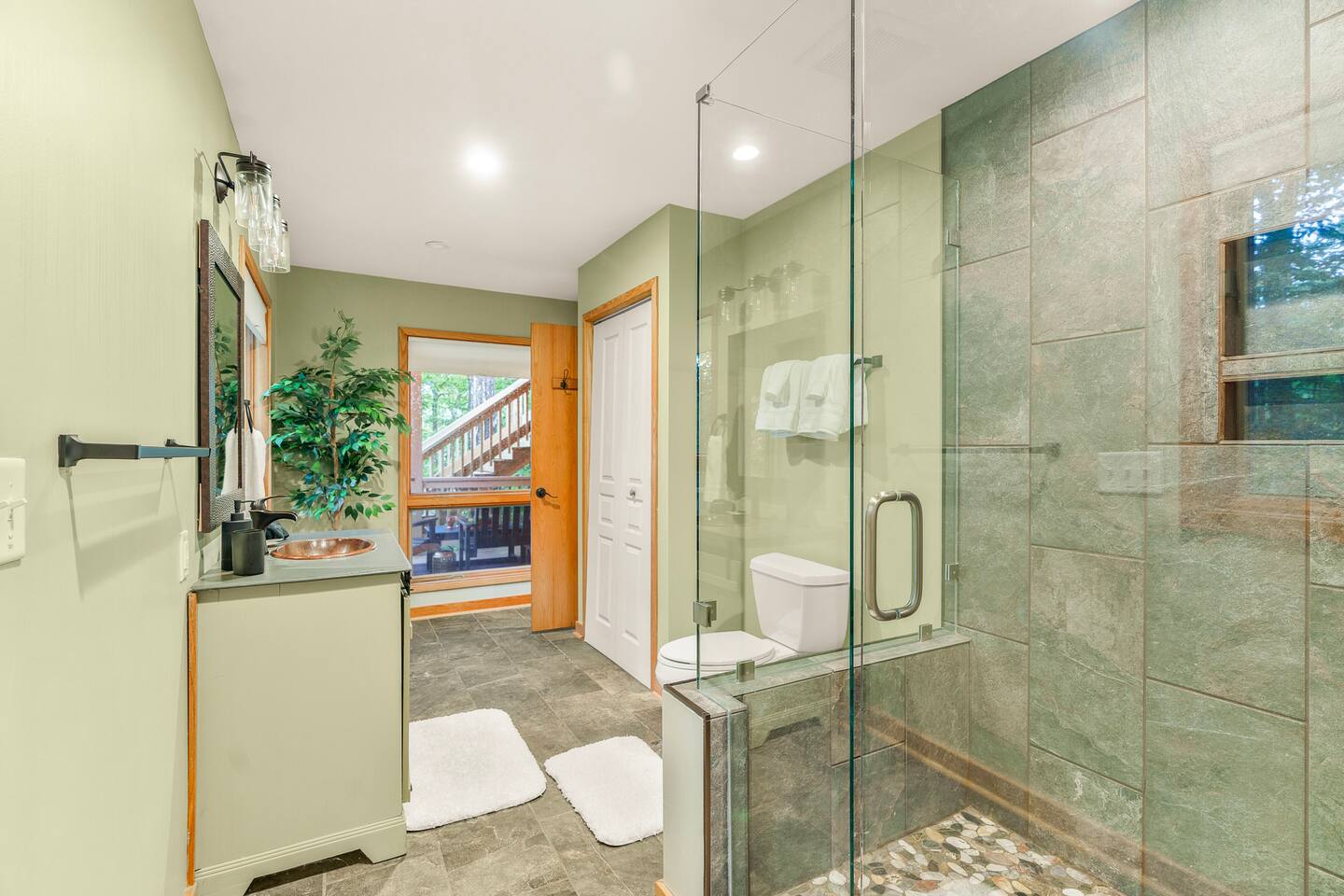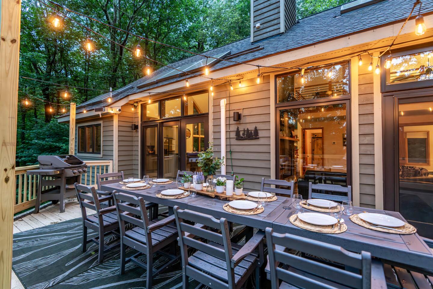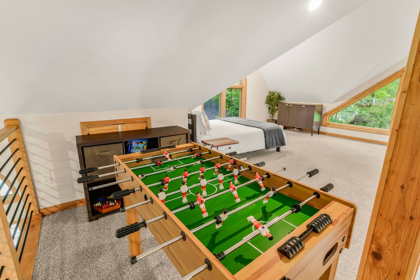 We are located in the heart of beautiful Wintergreen Virginia, which has tons to do for all ages, year-round. Mountain Treehouse is just a few minutes’ drive to the slopes and all the dining and entertainment at Wintergreen. Some of the best hiking trails in the state are off the Blue Ridge Parkway (15 minutes from the home), plus there are other great trails just down the street. Also nearby are two sandy-beach-entrance lakes plus a community pool for swimming, and over dozen wineries, breweries, and distilleries- all within a 30 minute drive. Additionally, after a 5 min hike to the base of our property, there is a hiking trail along a creek. In the summer time, supervised kids can play in the creek while adults breathe in the peaceful nature. After heavy rains, you can even hear the rushing waters from the mountain stream at the base of the property. Along that trail is a moderate hike out to Shamokin Falls, Wintergreen's own waterfall! The house has 4 bedrooms plus loft bedroom, and 3 bathrooms, with the layout as follows: Main level: - Main level deck features outdoor dining for 10, gas grill, rocking chairs, and bar seating - Living room with wood burning fireplace (firewood provided), 65" smart TV, and arcade machine - Newly renovated, oversized, and fully stocked kitchen with custom teak root stools surrounding island - Dining area features custom live edge table with seating for 6, plus room for 8 more at the kitchen island (14 seats total) - BR1: King bedroom with dedicated workspace - Full bath with tile shower Lower level: - Lower deck features new hot tub, barrel sauna, fire table (propane provided), and additional outdoor seating - BR2: Master bedroom with king bed and deck access. - Ensuite bathroom of BR2, fully renovated with double vanity, tiled shower, and soaker tub - BR3: King bedroom - BR4: Bunk room with 3 sets of twin-over-twin beds and built-in reading lights - "Jack and Jill" full bath: Shared bathroom between BR3 and BR4 with tile shower - Laundry room with full size washer and dryer Loft: - The Loft area is set up as Bedroom 5, but note that it is open to the living room area so not completely private. This room features a queen bed, smart TV, foosball table, and various games