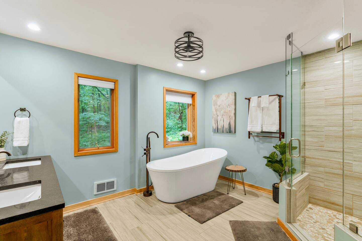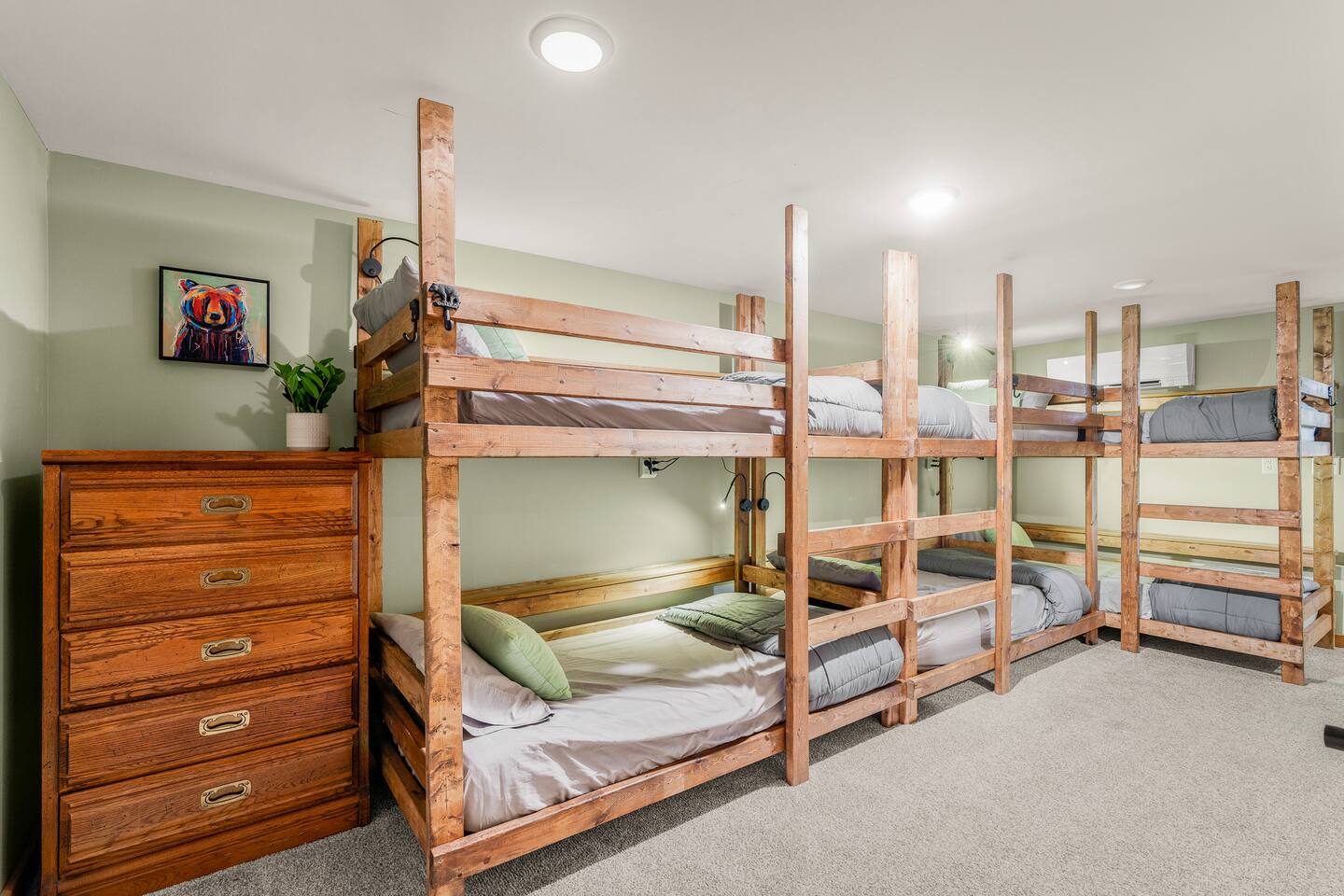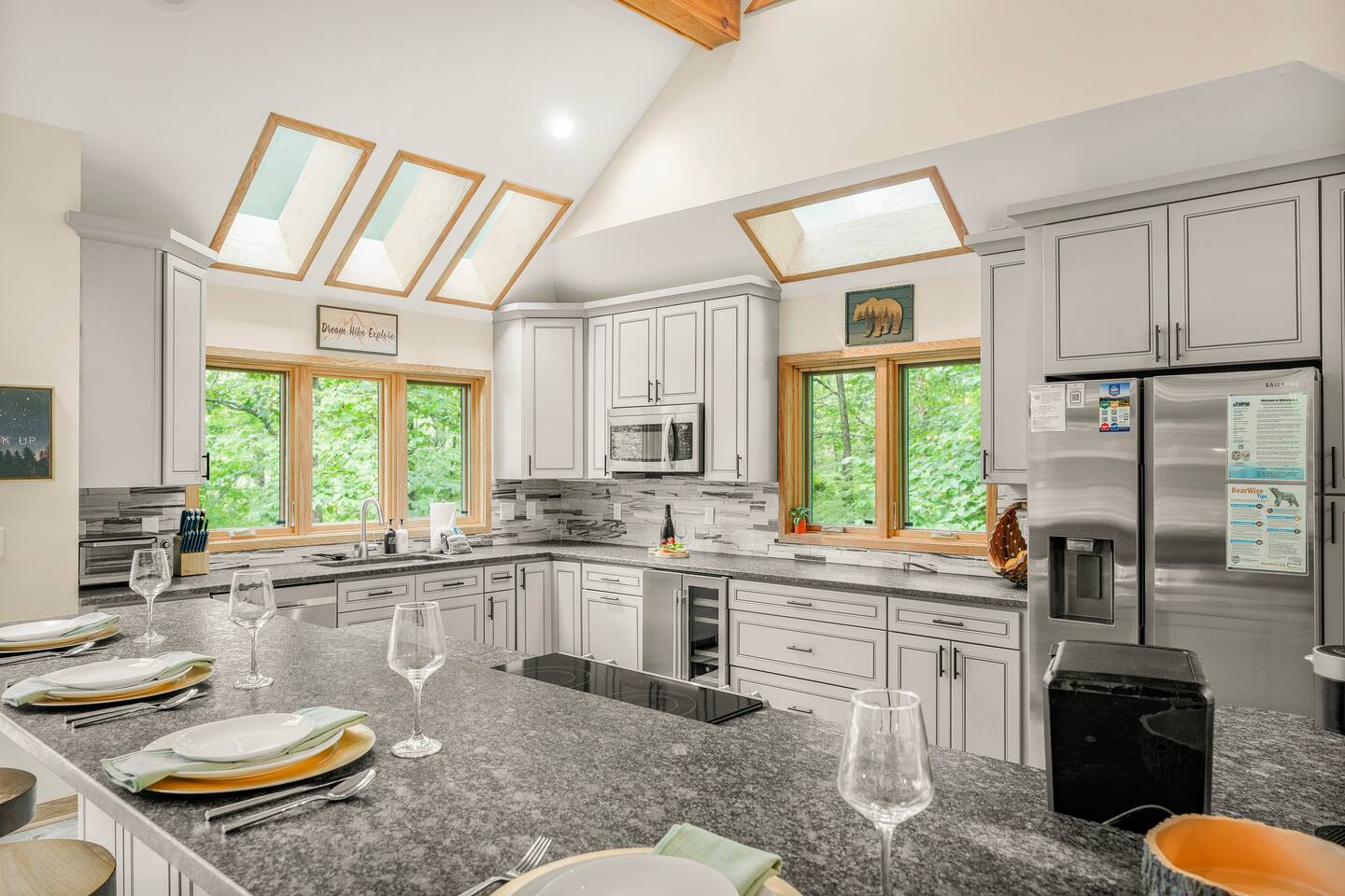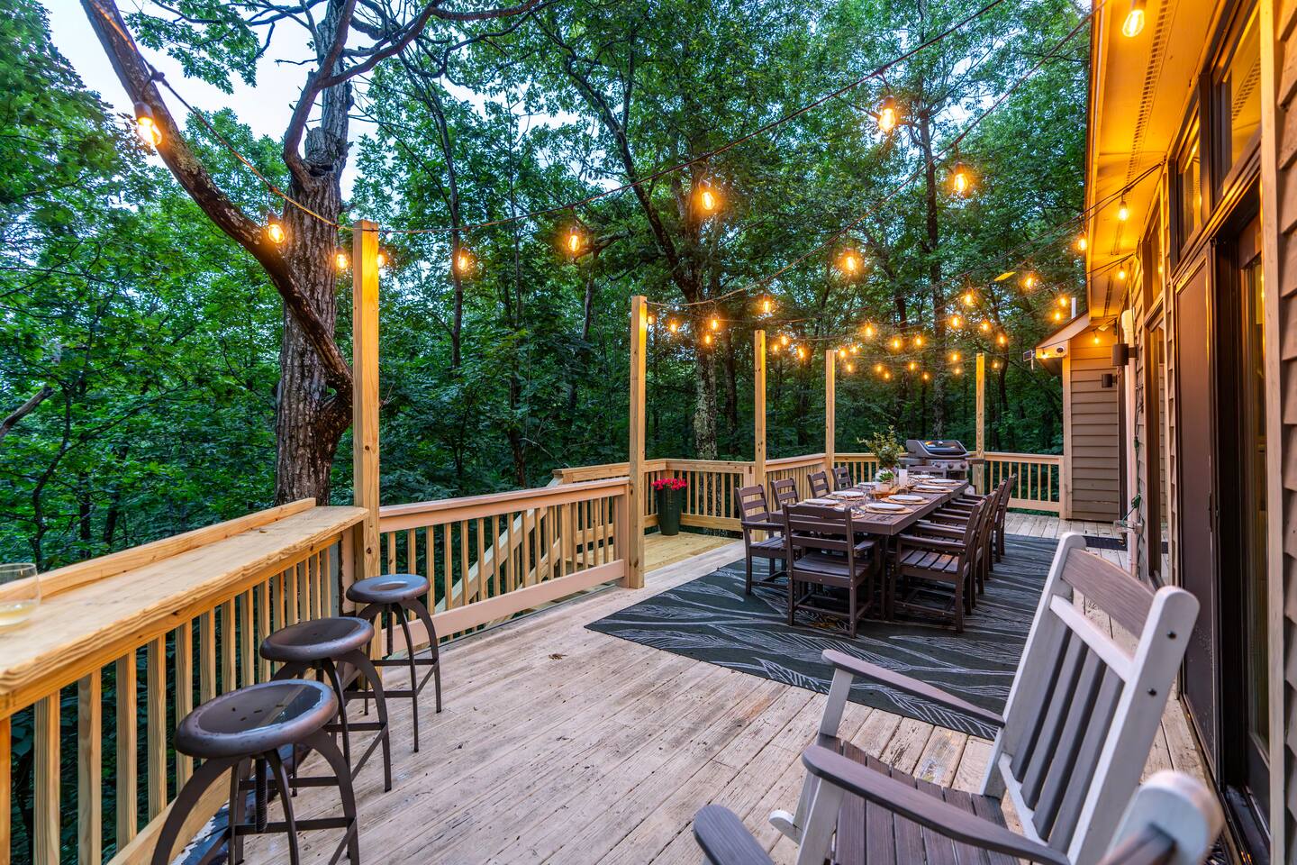 We are located in the heart of beautiful Wintergreen Virginia, which has tons to do for all ages, year-round. Mountain Treehouse is just a few minutes’ drive to the slopes and all the dining and entertainment at Wintergreen. Some of the best hiking trails in the state are off the Blue Ridge Parkway (15 minutes from the home), plus there are other great trails just down the street. Also nearby are two sandy-beach-entrance lakes plus a community pool for swimming, and over dozen wineries, breweries, and distilleries- all within a 30 minute drive. Additionally, after a 5 min hike to the base of our property, there is a hiking trail along a creek. In the summer time, supervised kids can play in the creek while adults breathe in the peaceful nature. After heavy rains, you can even hear the rushing waters from the mountain stream at the base of the property. Along that trail is a moderate hike out to Shamokin Falls, Wintergreen's own waterfall! The house has 4 bedrooms plus loft bedroom, and 3 bathrooms, with the layout as follows: Main level: - Main level deck features outdoor dining for 10, gas grill, rocking chairs, and bar seating - Living room with wood burning fireplace (firewood provided), 65" smart TV, and arcade machine - Newly renovated, oversized, and fully stocked kitchen with custom teak root stools surrounding island - Dining area features custom live edge table with seating for 6, plus room for 8 more at the kitchen island (14 seats total) - BR1: King bedroom with dedicated workspace - Full bath with tile shower Lower level: - Lower deck features new hot tub, barrel sauna, fire table (propane provided), and additional outdoor seating - BR2: Master bedroom with king bed and deck access. - Ensuite bathroom of BR2, fully renovated with double vanity, tiled shower, and soaker tub - BR3: King bedroom - BR4: Bunk room with 3 sets of twin-over-twin beds and built-in reading lights - "Jack and Jill" full bath: Shared bathroom between BR3 and BR4 with tile shower - Laundry room with full size washer and dryer Loft: - The Loft area is set up as Bedroom 5, but note that it is open to the living room area so not completely private. This room features a queen bed, smart TV, foosball table, and various games